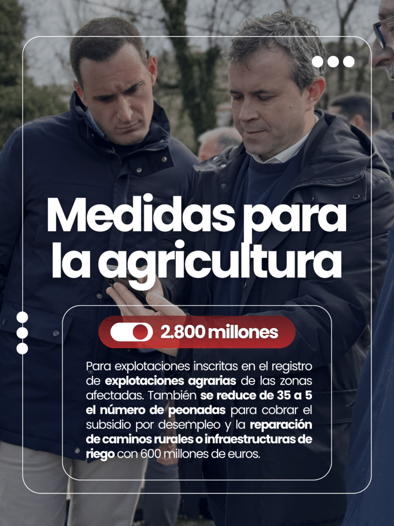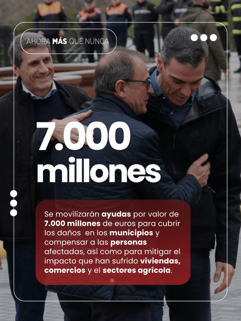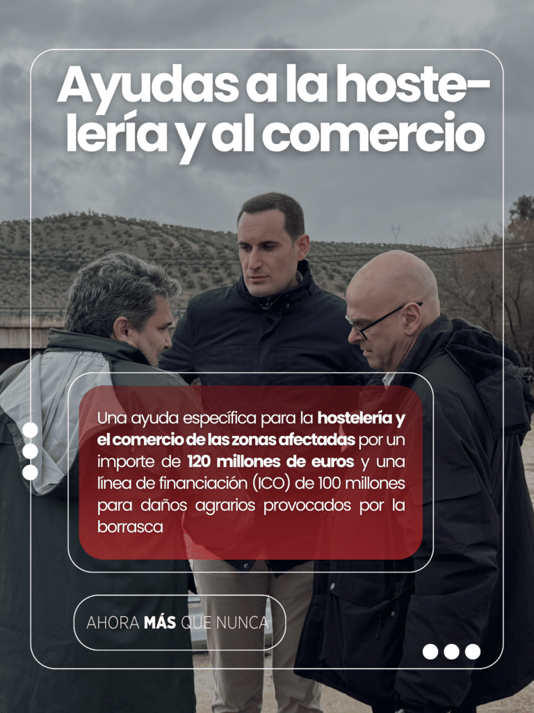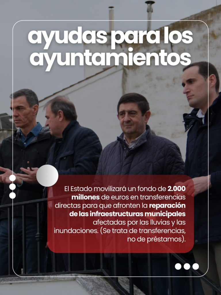 Latorre destacó que estos 7.000 millones de euros contemplan ayudas directas para las personas afectadas y 2.000 millones para que los ayuntamientos puedan reparar y rehabilitar infraestructuras. También hay ayudas para agricultores, ganaderos y explotaciones, reducción de las peonadas a 5 para acceder al subsidio agrario, subvenciones al comercio o un plan de empleo con 50 millones de euros, “medidas en definitiva que vienen a paliar una situación extraordinaria” como la que se ha vivido.
